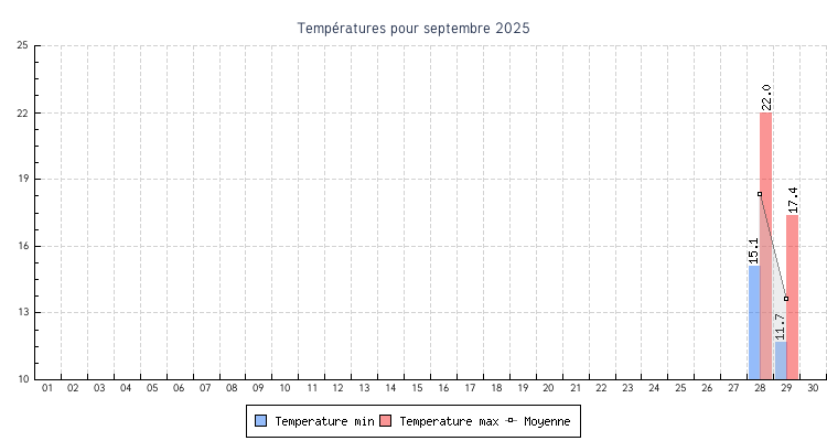 | 28 | 15.1 °C à 00:00 | 22.0 °C à 19:31 | 18.3 °C | 0.2 km/h (9.7 km/h) | 12 |