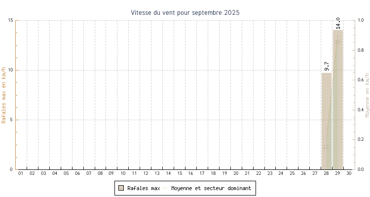 | 29 | 11.7 °C à 08:20 | 17.4 °C à 10:59 | 13.6 °C | 0.9 km/h (14.0 km/h) | 70 |